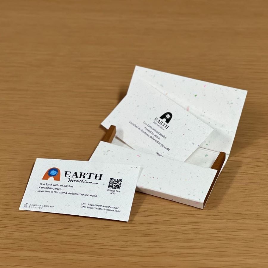 名刺1枚1枚に「折り鶴再生紙で作られています」の印字入り。