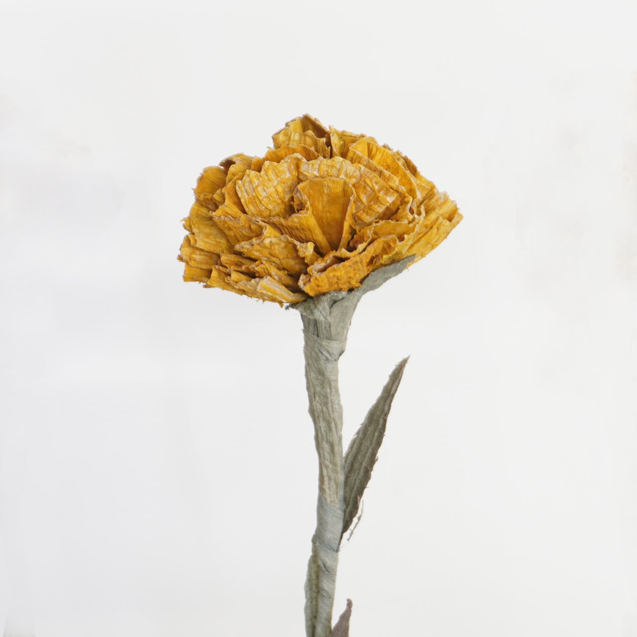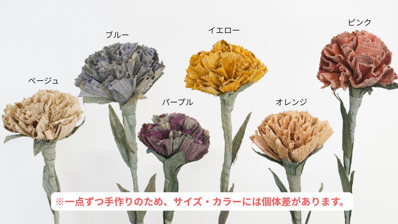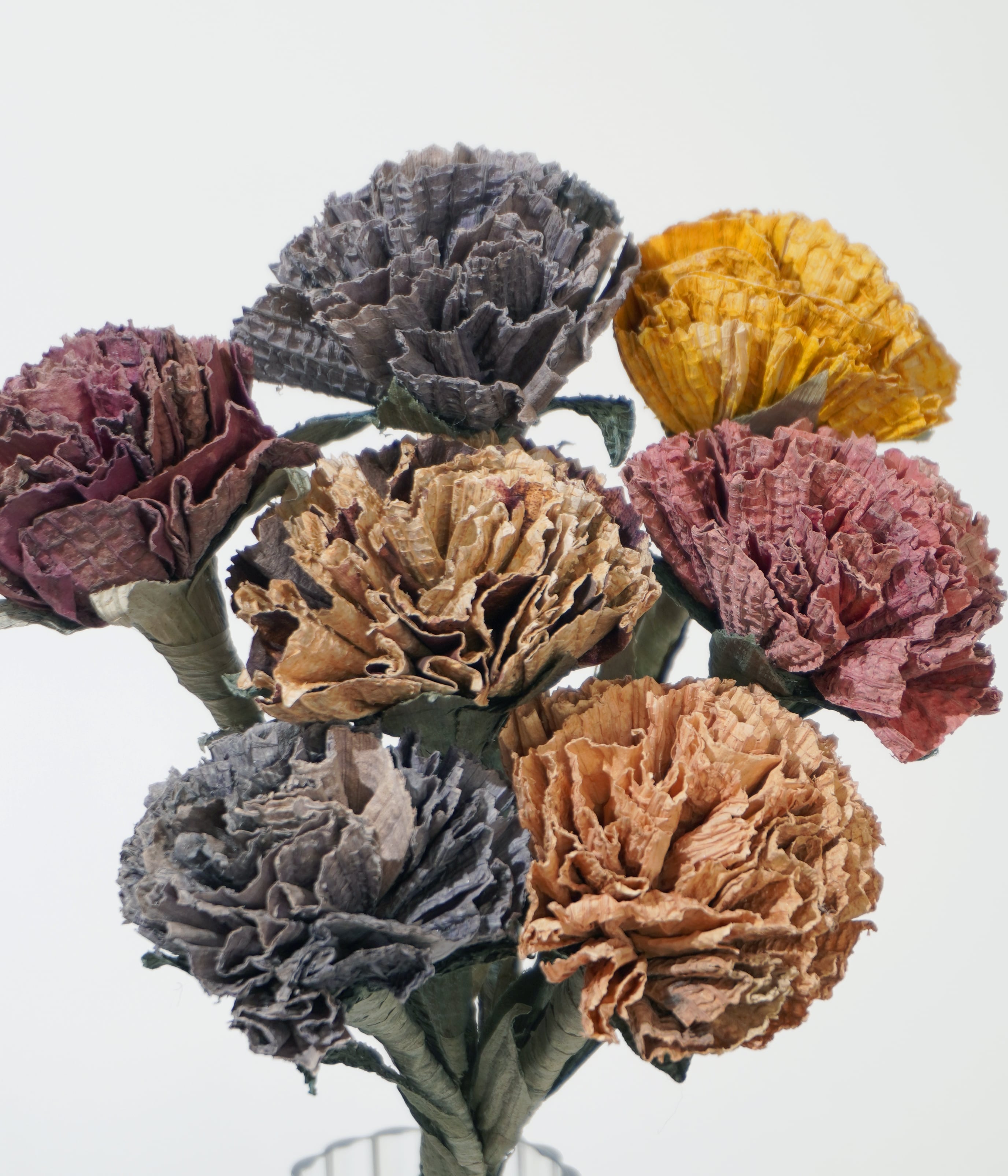 樹液を多く含み、加工が難しいとされるバナナの木の皮を乾燥させて使用し、美しいカーネーションが生まれました。ハイビスカスや藍、ウコンなどの天然染料で一つひとつ丁寧に手作業で染色。色味や形状はそれぞれ異なり、手にした人だけの特別なお花です。